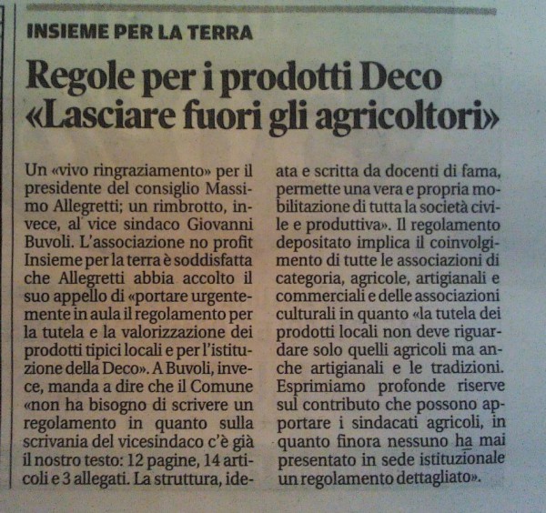 Pubblichiamo la nota integrale diffusa dal Presidente dell’Associazione Insieme per la Terra Nicola Gozzoli a risposta dell’articolo apparso sulla Gazzetta di Mantova ieri 5 gennaio 2015. Tutta l’Associazione di Insieme per la Terra manifesta vivo ringraziamento al Presidente Allegretti per aver accolto l’appello di portare urgentemente in aula il “Regolamento per la tutela e valorizzazione dei prodotti tipici locali e per l’istituzione della De.C.O.” da noi presentato grazie alla mozione della minoranza; avevamo il forte timore che il nostro progetto fosse stato dimenticato ed archiviato nelle cantine di Via Roma. L’amministrazione comunale non ha bisogno di scrivere un Regolamento in quanto sulla scrivania del Vice Sindaco Buvoli è già presente il testo da noi scritto formato da dodici pagine, strutturato in quattordici articoli e tre allegati. La struttura, ideata e scritta da docenti di fama nazionale ed internazionale, studiata nei minimi particolari, permette una vera e propria mobilitazione di tutta…