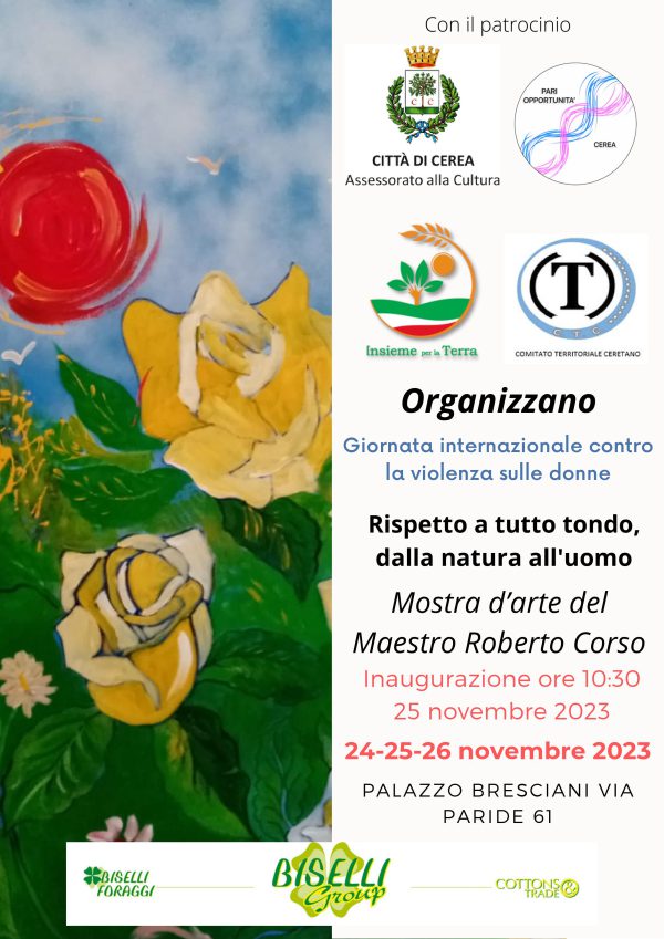 Nella giornata internazionale contro la violenza sulle donne la Fondazione Insieme per la Terra ha organizzato a Cerea (VR) un’evento artistico a Palazzo Bresciani dal 24 al 26 novembre 2023. La mostra del Maestro Roberto Corso, tra i maggiori esponenti del colorismo italiano, ha come titolo “Rispetto a tutto tondo, dalla natura all’uomo“. L’idea dell’evento è nata dalla lettura del libro “Salvarsi con il verde” di Andrea Mati, noto architetto e vivaista pistoiese. “… posso dire di aver imparato che tutti gli esseri umani quando cadono nel loro abisso hanno nella forma qualcosa di simile, è il “come” si salvano che è assolutamente unico. E se lo fanno grazie alle piante, chi sa osservare queste persone, noterà che emanano una discreta, operosa disponibilità verso gli altri, una sorta di RISPETTO amoroso verso ogni forma di vita.“ Un ringraziamento speciale a tutta l’Amministrazione della Città di Cerea, alla Vicesindaco e Assessore…