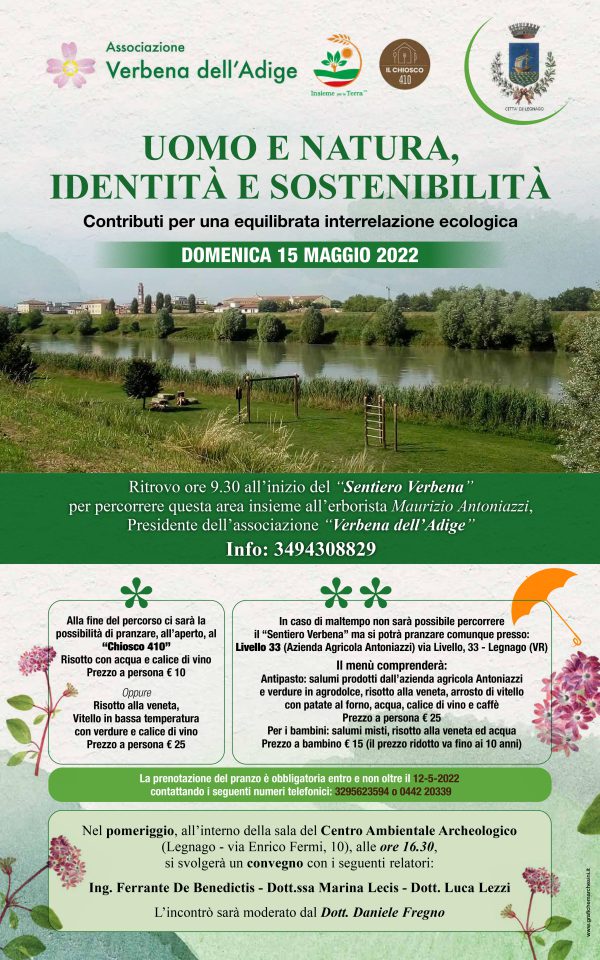 Domenica 15 maggio 2022 si svolgerà a Legnago un evento che offrirà ai cittadini la possibilità di approfondire la conoscenza di parte del nostro territorio e di affrontare il tema del rapporto fra Uomo e Natura. La giornata inizierà al mattino con una passeggiata lungo le rive dell’Adige sul “Sentiero Verbena”, durante la quale l’erborista Maurizio Antoniazzi, fondatore dell’Associazione La Verbena dell’Adige, farà conoscere ai partecipanti parte del patrimonio botanico di questo tratto del fiume che comprende anche piante rare a rischio di estinzione. Il pomeriggio sarà dedicato al tema “Uomo e Natura, Identità e Sostenibilità, contributi per una equilibrata interrelazione ecologica” con un convegno presso la sala del Centro Ambientale Archeologico, moderato dal Dott. Daniele Fregno. Dr. Nicola Gozzoli Presidente Fondazione Insieme per la Terra