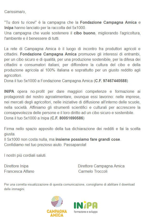 “Dio vede e provvede” è il caso di dire per descrivere quello che succede nel più grande sindacato cattolico italiano. Per rimpinguare le casse, dopo la recente disponibilità del Governo, è stata lanciata su tutti i media l’operazione del 5×1000 a beneficio della Fondazione Campagna Amica: “Una campagna che vuole sostenere il cibo buono, migliorando l’agricoltura, l’ambiente e il benessere di tutti. La rete di Campagna Amica è il luogo di incontro fra produttori agricoli e cittadini. Fondazione Campagna Amica promuove gli interessi di entrambi, per un cibo sicuro e di qualità, per una produzione sostenibile, per la difesa dei cittadini e consumatori italiani, per diffondere la cultura del cibo e della produzione agricola al 100% italiana e soprattutto per un giusto reddito agli agricoltori.“ Vi confesso che davanti a queste dichiarazioni non so se ridere o se piangere. Innanzitutto vorrei ricordare che non è reso pubblico ne lo statuto…