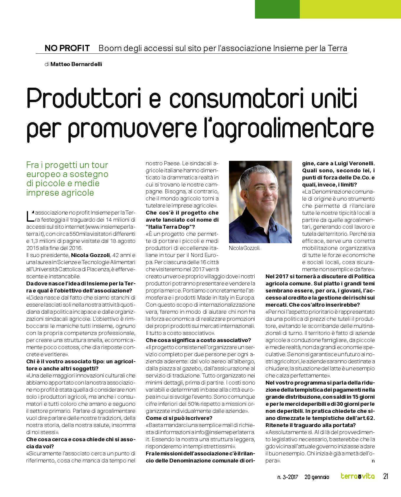 Oggi pubblichiamo l’intervista integrale rilasciata dal Presidente della nostra no profit Dr. Nicola Gozzoli a Terra e Vita, punto di riferimento editoriale nel panorama agricolo nazionale. Approfittiamo dell’occasione per ringraziare il Dr. Matteo Bernardelli per l’elevata serietà e professionalità dimostrata nell’intervista. L’associazione no profit Insieme per la Terra festeggia il traguardo dei 14 milioni di accessi sul sito internet (www.insiemeperlaterra.it), con circa 550.000 visitatori differenti e 1,3 milioni di pagine visitate dal 18 agosto 2015 alla fine del 2016. Il suo presidente, Nicola Gozzoli, 42 anni e una laurea in Scienze e Tecnologie Alimentari all’Università Cattolica di Piacenza, è effervescente e instancabile. Terra e Vita gli ha rivolto qualche domanda. Presidente Gozzoli, da dove nasce l’idea di Insieme per la Terra e qual è l’obiettivo dell’associazione? “L’idea nasce dal fatto che siamo stanchi di essere lasciati soli nella nostra attività quotidiana dalla politica incapace e dalle organizzazioni sindacali agricole. L’obiettivo…