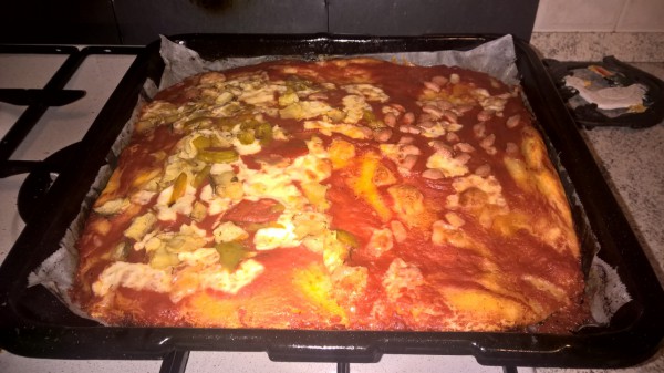 Pane, pizza e focacce PIZZA CASALINGA Introduzione Beh.. che dire???!! Non potremmo permetterci di essere italiani, se non amassimo la pizza!!! Noi in famiglia l’adoriamo… Dopo tanti anni di prove alla fine sono riuscita a trovare la “nostra” ricetta di casa. Ed oggi ve la illustro. Proviamo? Tempo di preparazione: 20 minuti Tempo di lievitazione: 1 ora Tempo di cottura: 10 minuti Ingredienti per la pasta della pizza 300 gr. di farina tipo “00” 170 gr. di farina manitoba 240 ml. d’acqua a temperatura ambiente 4 gr. di lievito 10 gr. di sale 24 gr. di olio extravergine d’oliva Ingredienti per la farcitura q.b. di olio extravergine d’oliva q.b. di passata di pomodoro q.b. di sale q.b. di pepe q.b. di mozzarella per pizza q.b. di wurstel q.b. peperoni grigliati q.b. di carciofini Preparazione In una ciotola mettete l’acqua, il sale, il lievito e 4 cucchiai di farina “00” e iniziate ad amalgamare gli ingredienti.…