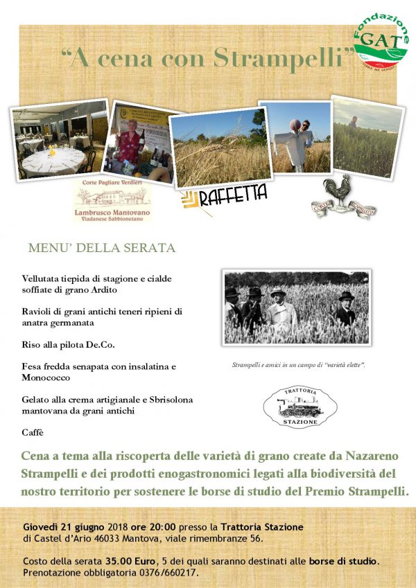 Nel solstizio d’estate la Fondazione GAT annuncia nei GR della nota emittente radiofonica privata Radio Bruno la seconda edizione de “A cena con Strampelli“: DR. NICOLA GOZZOLI – VICE PRESIDENTE FONDAZIONE GAT Nel primo giorno d’estate la Fondazione GAT renderà omaggio a Nazareno Strampelli, il più grande agronomo e genetista italiano, che ha creato e studiato i famosi “grani antichi”. Il nostro ruolo come Fondazione GAT sarà quello di rendere la biodiversità quotidiana, facendola conoscere e riconoscere a tavola grazie ad aziende agricole locali. Nella quota stabilita di 35 euro per persona è compresa una donazione di 5 euro alla Fondazione GAT che sarà utilizzata per le borse di studio destinate agli studenti meritevoli degli Istituti Agrari ed Alberghieri. La raccolta delle risorse economiche per le borse di studio ha avuto un successo superiore alle previsioni tanto che stiamo valutando l’impostazione di una seconda edizione. DR. MARCELLO TRAVENZOLI –…