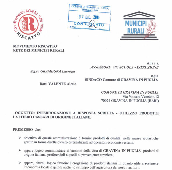 La voglia del Km0 tra i cittadini e tra gli stessi Enti istituzionali continua a crescere giorno dopo giorno. A Gravina in Puglia (BA) il Movimento Riscatto – Coordinamento No IMU sulle Terre e Municipi Rurali hanno insieme depositato in Comune una interrogazione urgente con risposta scritta relativa all’utilizzo di prodotti lattiero caseari presso le scuole pubbliche locali. La richiesta indirizzata al Dr. Valente Alesio, Sindaco della Città pugliese, e all’Assessore alla Pubblica Istruzione Gramegna Lucrezia è stata voluta fortemente dal Presidente del Movimento Riscatto Francesco Mastromarco. E’ indispensabile fare prima un censimento su quanti e quali prodotti delle multinazionali e locali vengano distribuiti nelle mense ai nostri bambini e ragazzi così da poter privilegiare, nei prossimi appalti scolastici, il consumo di alimenti prodotti da Aziende locali ed ottenuti con materia prima prevalentemente della zona. E’ indubbio che primaria deve essere la sensibilizzazione delle Istituzioni locali, più vicine alla gente,…