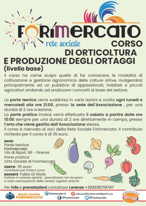 A partire da domani 17 gennaio 2022 alle ore 21:00, avrà inizio un corso teorico – pratico di: ORTICOLTURA E PRODUZIONE DEGLI ORTAGGI (livello base) La parte teorica verrà suddivisa in varie lezioni e svolta ogni lunedì e mercoledì alle ore 21:00, presso la sede dell’Associazione Forimercato in via di Ripoli 96 a Firenze per una durata di 2 ore a lezione. La parte pratica invece verrà effettuata il sabato a partire dalle ore 10:00 sempre per una durata di 2 ore direttamente in campo, presso l’orto sociale gestito dall’Associazione stessa. Il contributo richiesto per il corso è 35 € a persona. Docente: Fabio Di Gioia Dottore in scienze agrarie, specializzato nel recupero e nella valorizzazione delle varietà vegetali antiche. Per informazioni e prenotazioni contattare Lorenzo +393336719747 Programma: Parte teorica Lunedì 17 gennaio 2022 ore 21:00 1. Tipologie di orticoltura presenti in Italia. 2. Fattori climatici che influenzano la produzione degli…
