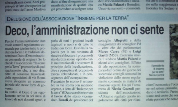 Il quotidiano La Voce di Mantova ha pubblicato in data odierna un articolo relativo all’attuale stagnazione della discussione ed approvazione del De.C.O. da noi presentato a Mantova, capitale della cultura anno 2016. Perché l’amministrazione non vuole votare il “Regolamento comunale per tutelare tutte le produzioni locali e le tradizioni denominato De.C.O.” (Denominazione Comunale di Origine)? Se lo chiede l’Associazione “Insieme per la Terra” promotrice di quel regolamento che, a suo dire, oltre al consenso trasversale delle opposizioni di via Roma, aveva strappato un consenso iniziale alle stesse forze di governo. In sintesi il De.C.O. è un regolamento scritto in sei mesi di lavoro da noti docenti agrari, parla di tutti i prodotti locali (agricoli e non) e di tutte le tradizioni locali. Esso ha la capacità, per la sua struttura, di riuscire a bloccare il processo di standardizzazione operato dalle multinazionali e sostenere il principio della localizzazione, oltre a permettere…